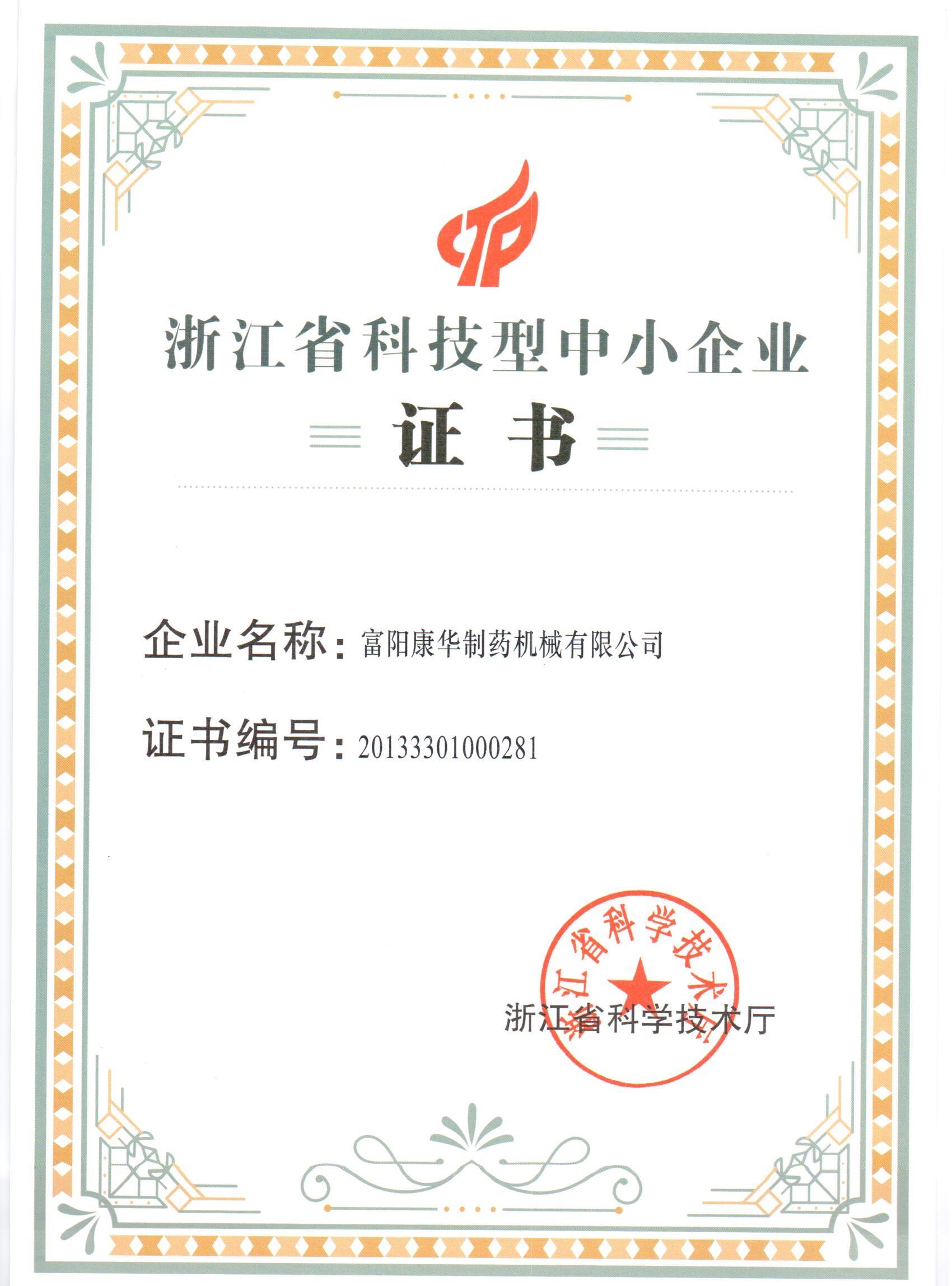• 浙江省科技型中小企業證書(2013年)
